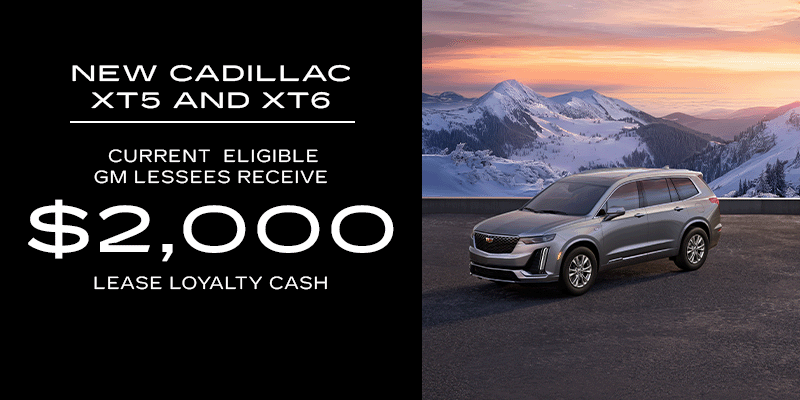 Must be a current lessee of a 2021 model year or newer GM vehicle through GM Financial or Cadillac Financial for at least 30 days prior to the new vehicle sale. Not available with some other offers. Take new retail delivery by 3/2/26. © 2026 General Motors. Cadillac Financial and the Cadillac logo are trademarks and/or service marks of General Motors LLC, used with permission. Cadillac Financial is a division of GM Financial. All Rights Reserved. Cadillac® XT6®